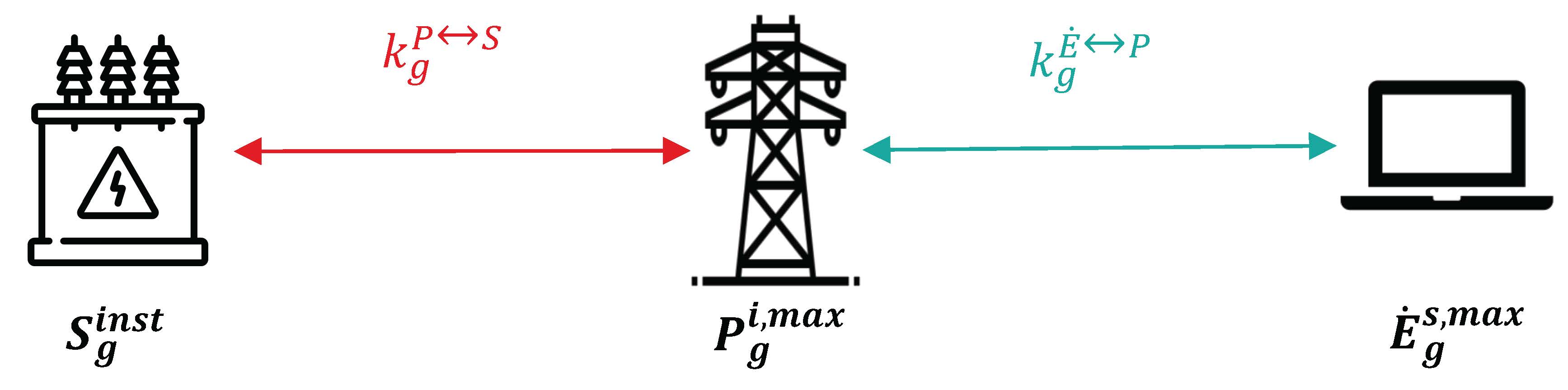 Energy system modeling involves creating digital twins of energy systems by integrating technical and economic assumptions. The link from the real-world dimension to the model is determined by integrating scaling factors \( \mathbf{k_g^{i \leftrightarrow j}} \) (see Figure 2). The relationship between the real-world installation and the observed power \( \mathbf{k_g^{P \leftrightarrow S}} \) corresponds to the security coefficient used by engineers when determining transformer size \( \mathbf{S_g^{inst}} \), based on the observed maximum power in the grid \( P_g^i \). This observed power can be modeled within the energy system digital twin \( \mathbf{\dot{E}_g^s} \), which is linked to the grid's maximum power \( \mathbf{P_g} \) through scaling factors \( \mathbf{k_g^{P \leftrightarrow S}} \).