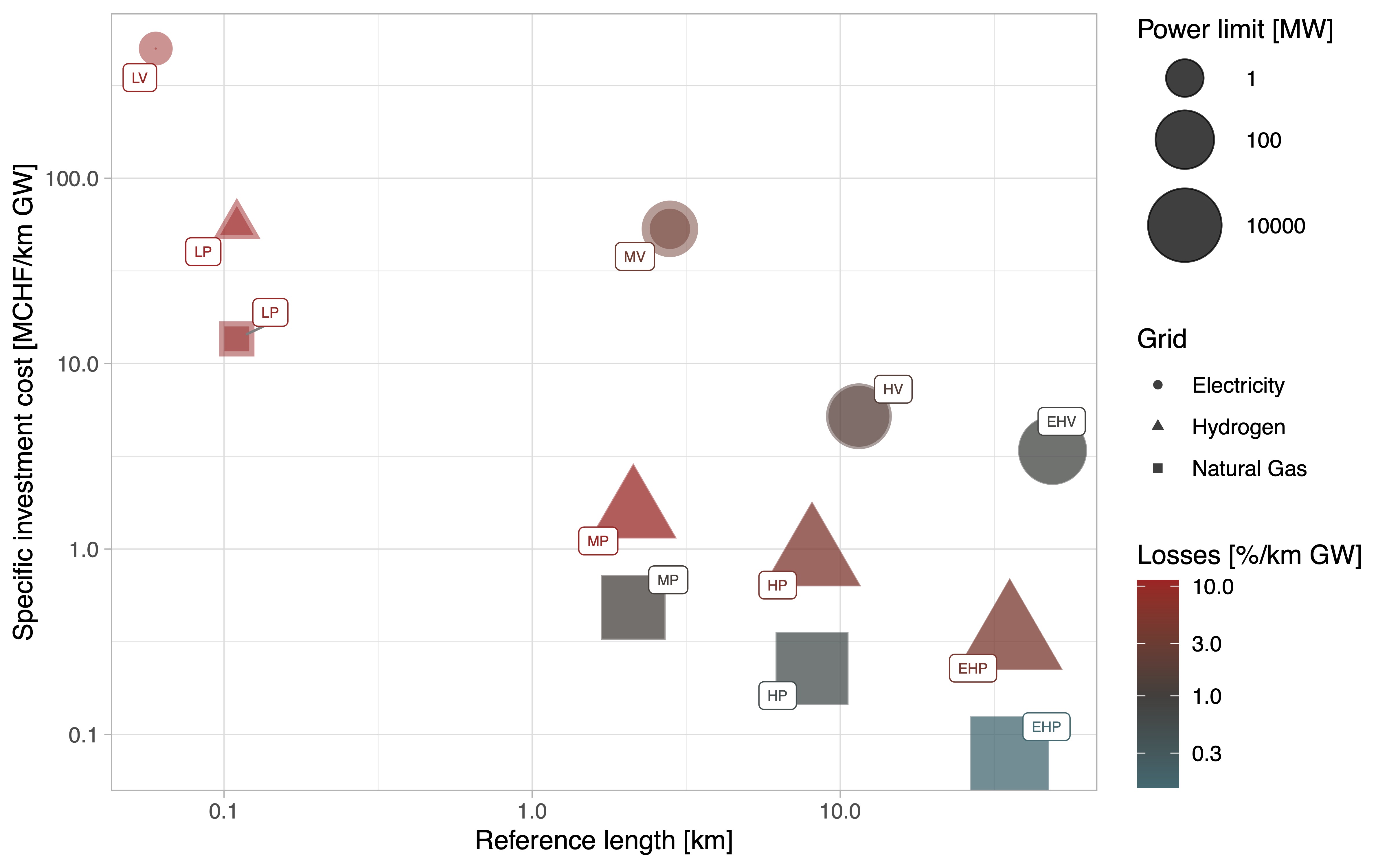 Figure 5: Grid infrastructure techno-economic characterization of electricity (circles), hydrogen (triangles), and methane (squares) grids split into four power levels (extra high, high, medium, low pressure/voltage).