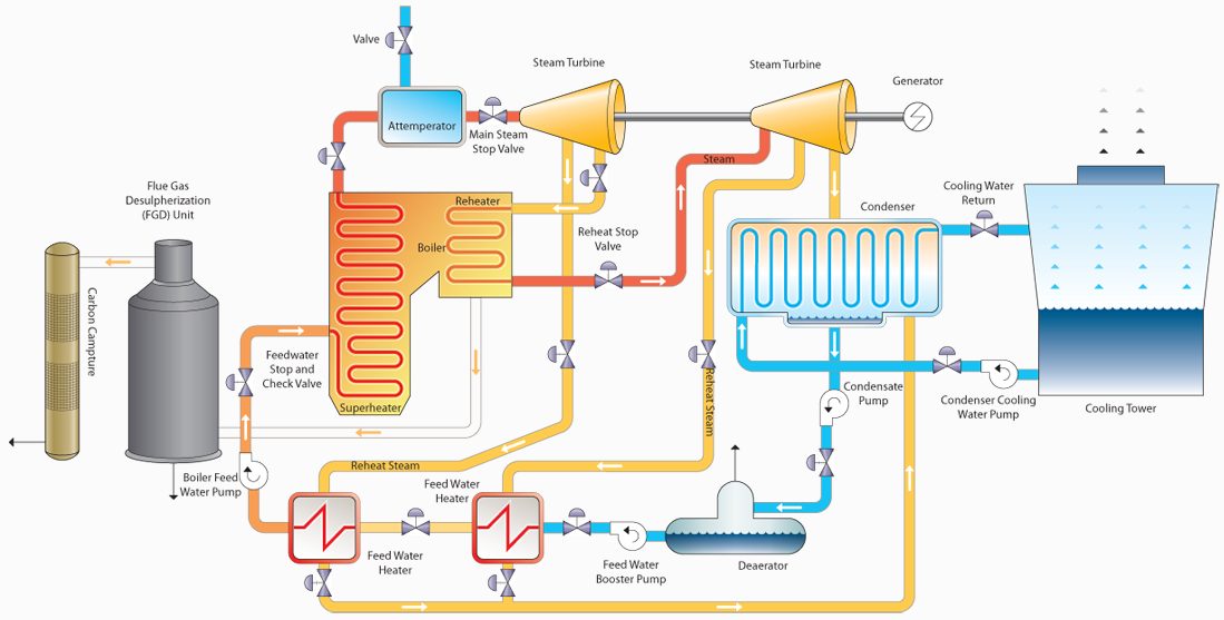 Coal is a combustible rock containing mostly carbon (C) with variable amounts of other elements such as oxygen (O), hydrogen (H), nitrogen (N), sulphur (S) and ashes. Coal power plants are thermal power stations which burn coal to generate electricity. Coal is first pulverised and then burned in a furnace with a boiler, generating thermal energy (step 1). The produced heat is transferred to a working fluid, usually water that turns into steam and is superheated (step 2). The produced steam runs through a power cycle, driving a steam turbine in which mechanical power is generated (step 3). The typical value of coal power plant efficiency is about 0.4.