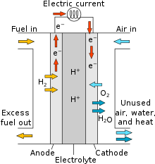 - Hydrogen Supply: Hydrogen gas (H2) is supplied to the anode side of the fuel cell.