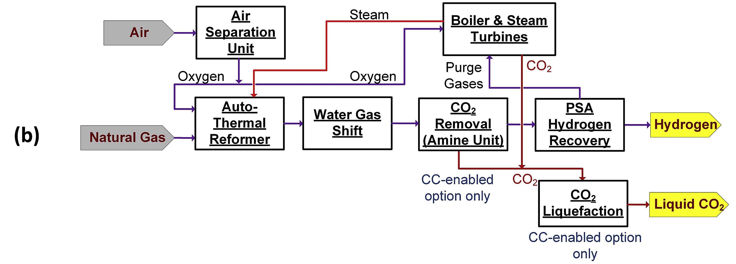 Simplified block diagrams of hydrogen production technologies: (b) ATR natural gas reforming